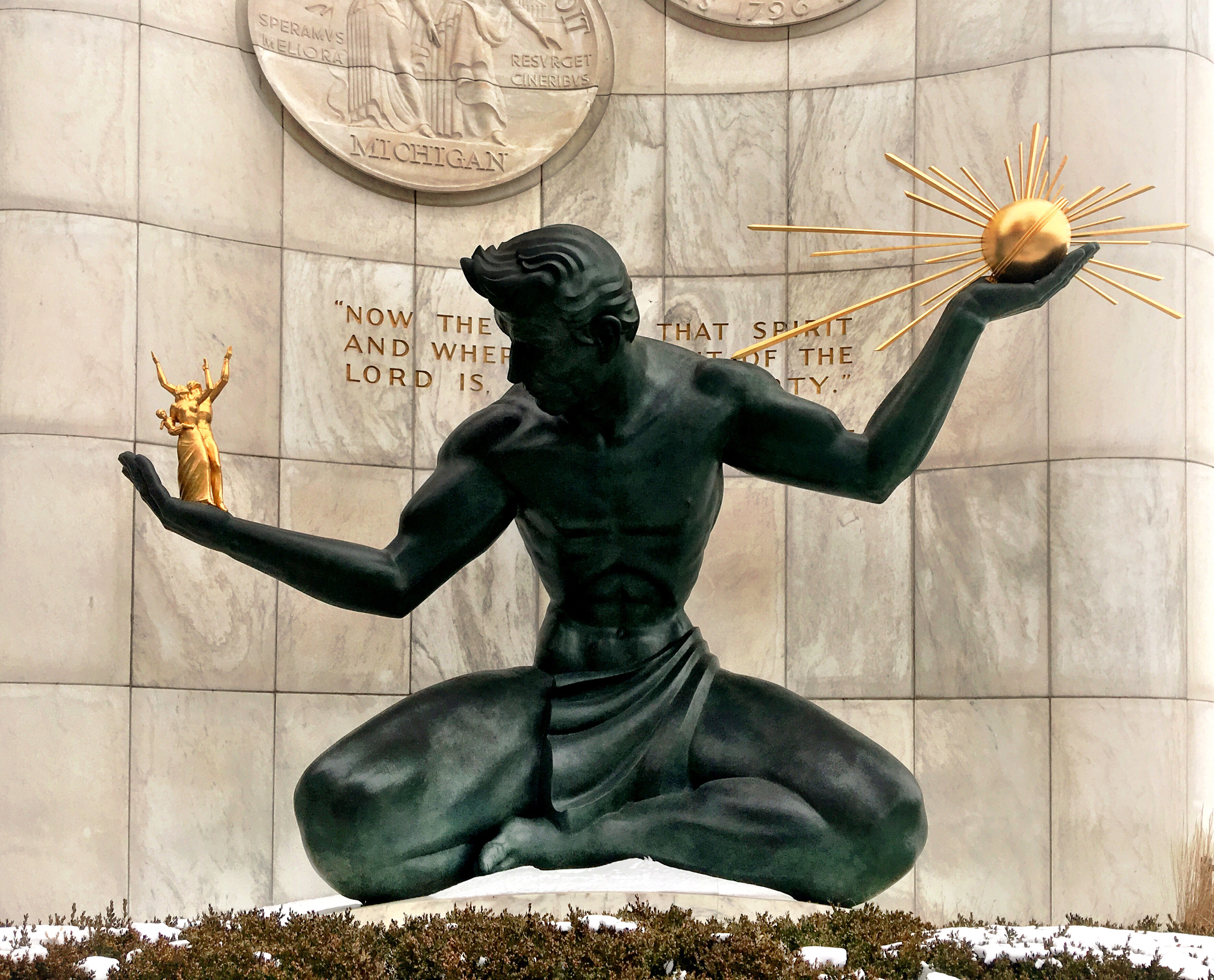 This was my first time seeing the Spirit of Detroit in person, and I must say I was blown away by how much this statue really does personify this city. In one hand the statue holds a golden orb meant to represent the faith of Detroiters, in the other hand he holds the people of his city. The massive bronze monolith personifies the heart, tenacity, passion and faith in this city by each citizen of Detroit and their commitment to move forward in a new direction.