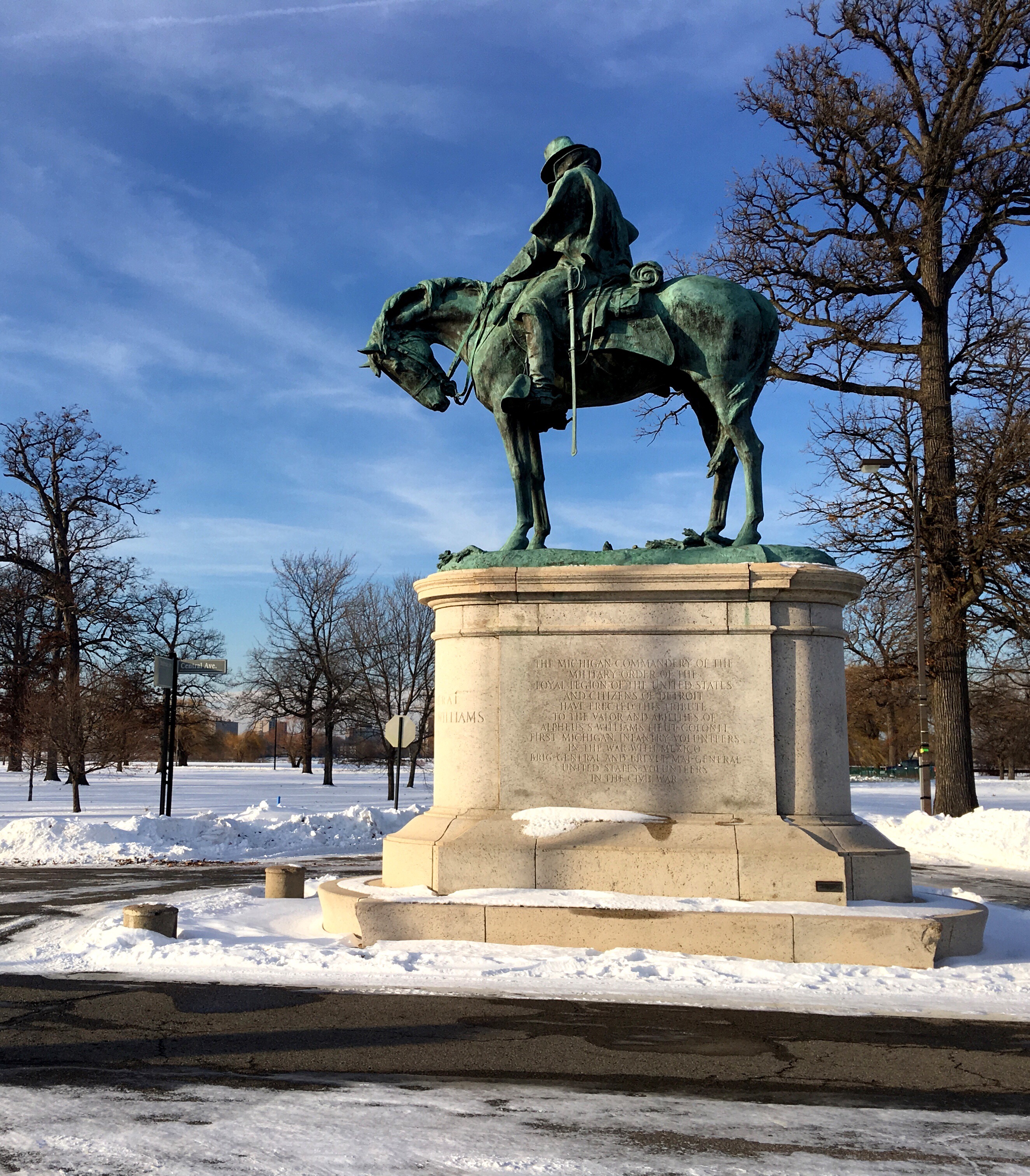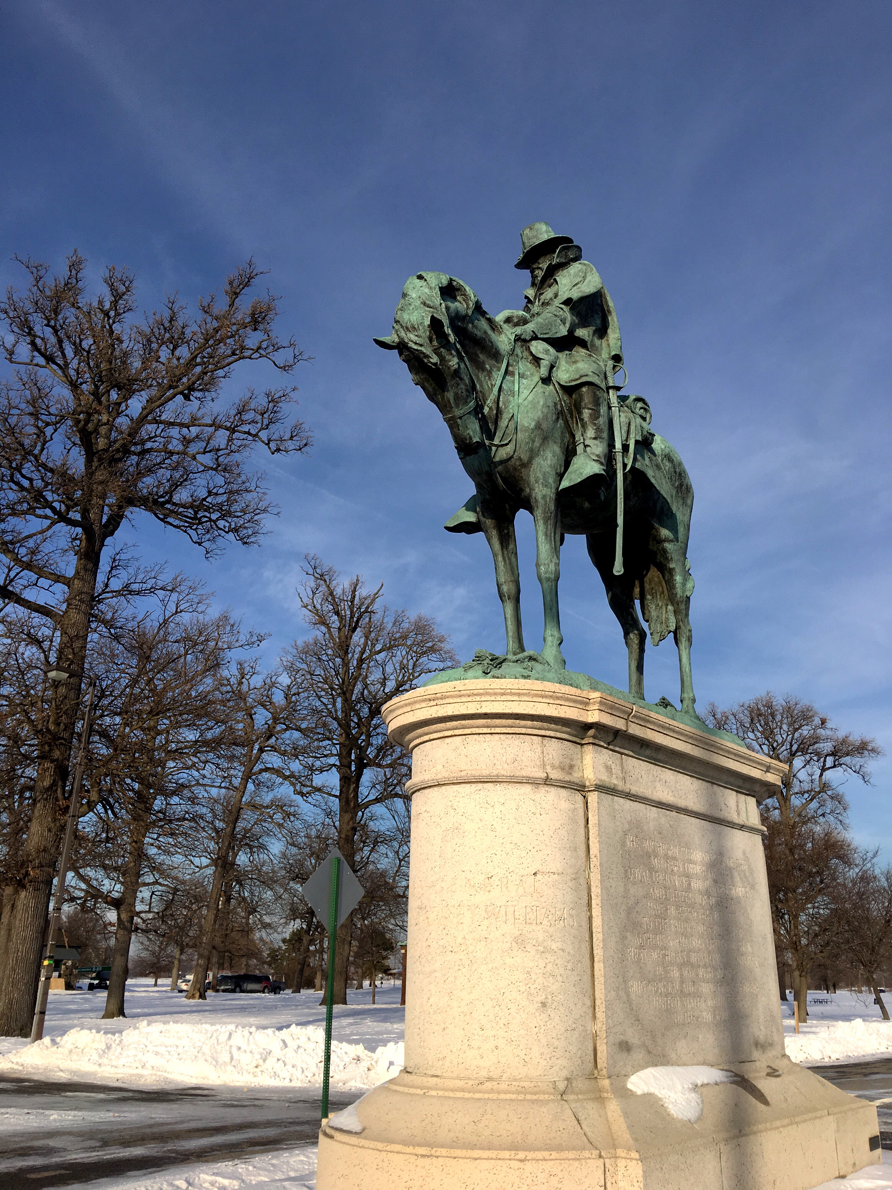 On Belle Island, Lieutenant Colonel Alpheus Starkey Williams and his favorite warhorse Plug Ugly stand at the crossroads of the island. Williams was a veteran of both the Mexican American War and the American Civil War, a judge, lawyer, journalist and eventual US Congressman. His gaze surveys the whole island, in a stunning monument to one of Detroit’s most most accomplished men of the 19th century.
