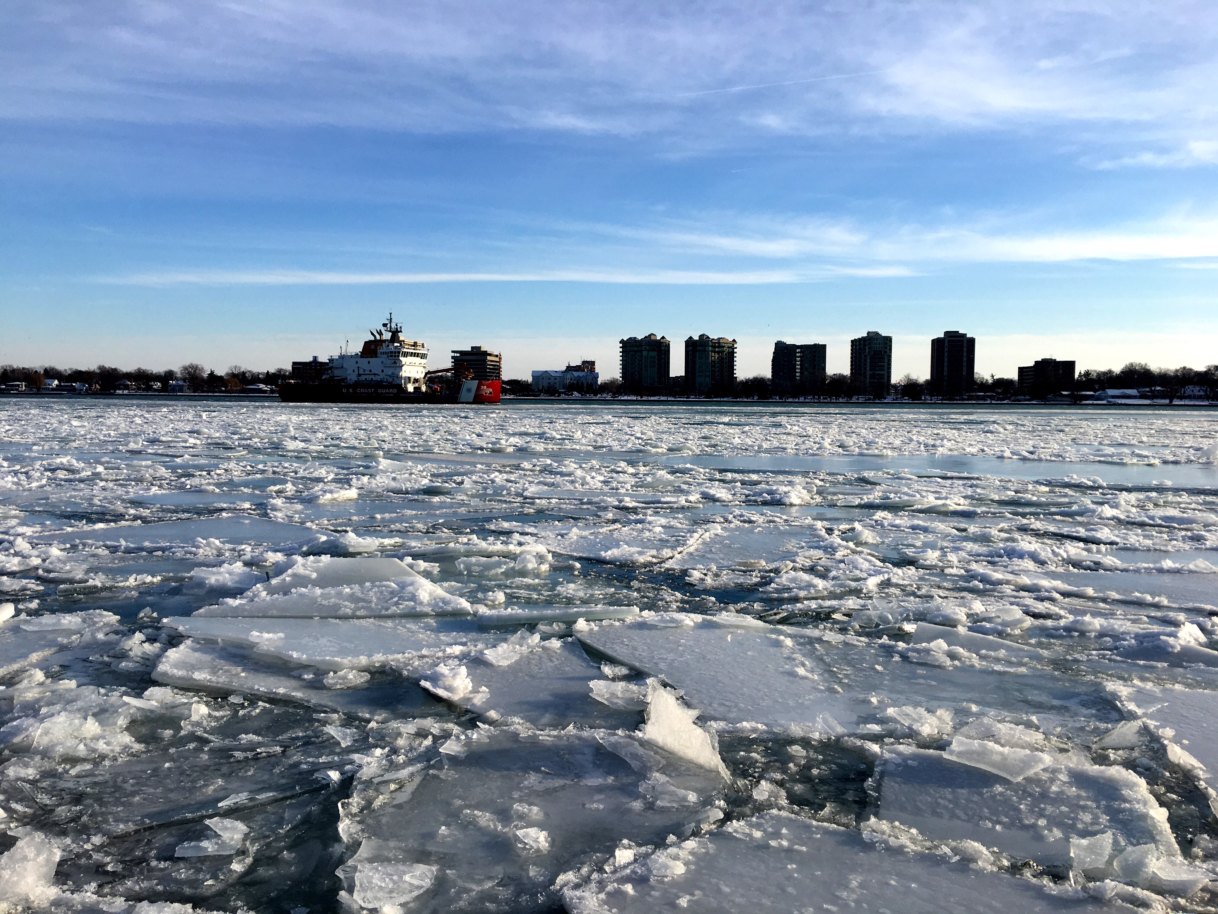Though it brutally cold and windy, I couldn’t help but to take another trip down to the Detroit River to shoot. The shattered ice littering the shoreline was oddly beautiful. It was as if a giant pane of glass had been destroyed and the shards were pushed to the shoreline by the river’s irreverent current. While I was there, a US Coast Guard ship was smashing its way through the remaining ice sheets in the center of the river. A loud scraping could be heard as the ice chunks brushed against a buoy in the center of the river.